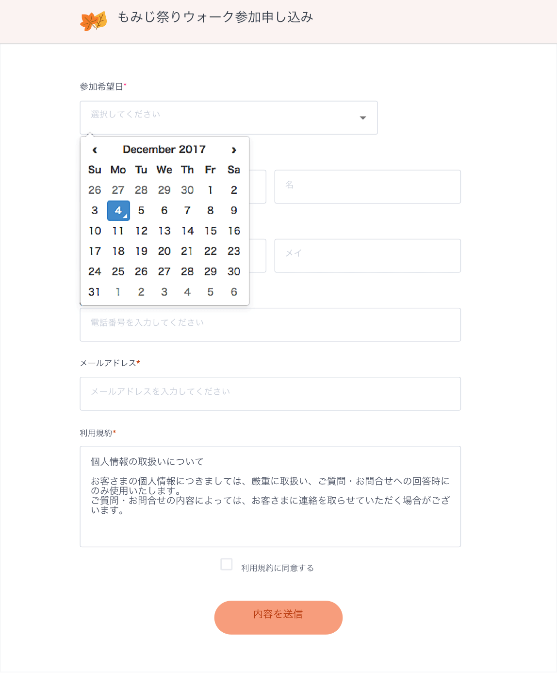 セミナー予約や来店予約などをさせたい場合、希望する日程をわかりやすく選択できるようにカレンダーを表示して希望日を選べるフォームがあると便利です。